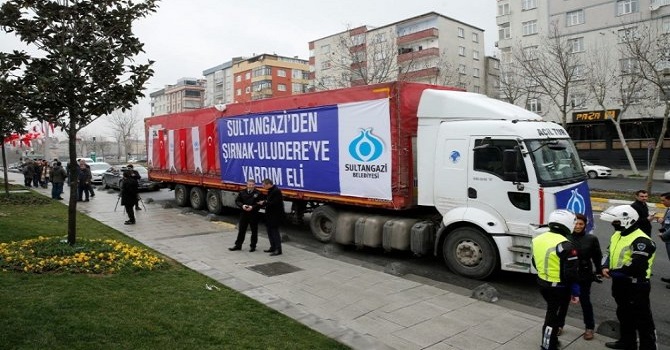 İstanbul Sultangazi Belediyesi, Şırnak'ın Uludere ilçesine 2 tır dolusu yardım gönderdi. Belediye binası önünden dualar eşliğinde yola çıkan tırlar, Uludere'deki birçok vatandaşın ihtiyacını karşılayacak.