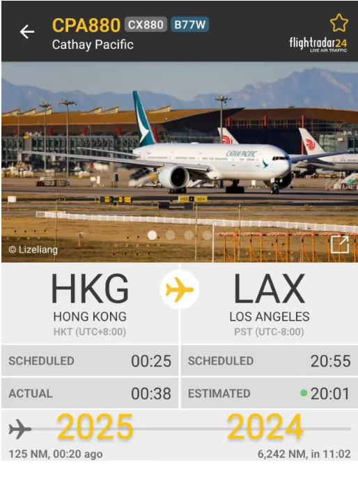 Hong Kong'dan 2025'te havalanan bir uçak, ABD'nin Los Angeles eyaletine 2024'te iniş yaptı.