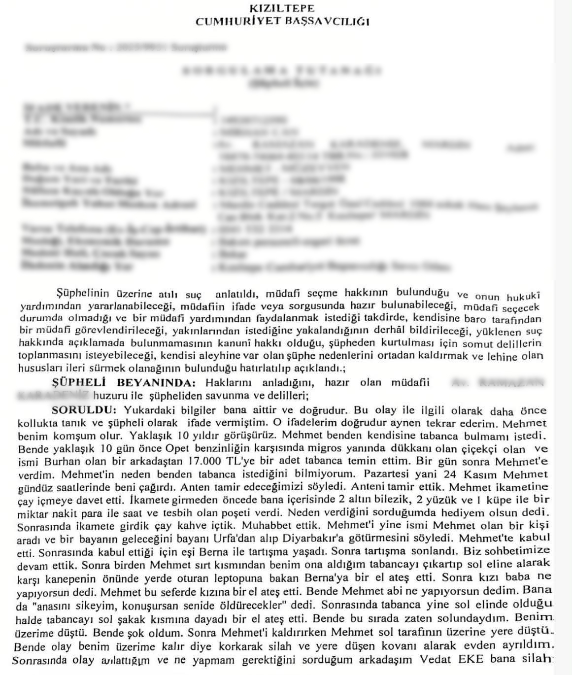 Mirhan C, üç kişiyi öldürdüğü iddiasıyla olay yerinden kaçtıktan sonra ilk olarak arkadaşı V. E’nin yanına gitti. İfadeye göre, cinayeti ve yaşananları tüm çıplaklığıyla V. E.'ye anlatan zanlı, ondan yardım istedi.