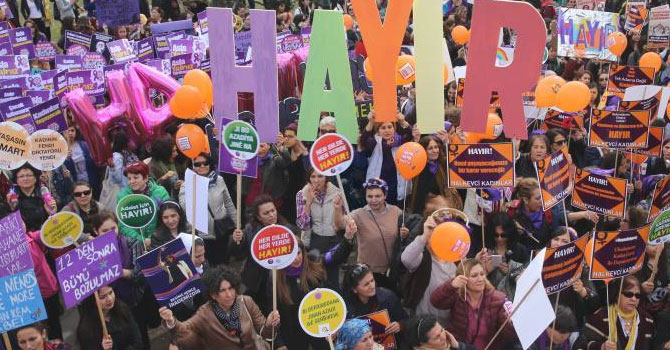 Açıklamada, kadınların birlikte çok daha güçlü oldukları vurgulanarak, “Kadınlar 158 yıl önce insanca çalışma hakları sahip olmak için çıktılar yola. O günden bu güne özgürlüğümüze yönelik baskılar hep var oldu. Eril egemen baskılara karşı öz gücümüzle karşılık vermeliyiz” denildi. Başkanlık sisteminin “kadın haklarına yönelik bir saldırı” olduğu belirtilen açıklamada, “OHAL'i olağanlaştırarak topluma dayatılan, bu referandum süreci haklarımıza saldırıdır. Anayasa değişikliği olacaksa kadınların da sözü olmalıdır. Biz sözümüzü 'Hayır' ile söyleyeceğiz'' denildi.