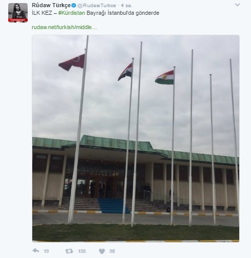 Barzani'ye yakınlığıyla bilinen Rûdaw'ın mubahiri Rawin Sterk, Atatürk Havalimanı’nda ilk kez Kürdistan Bayrağı’nın göndere çekildiğini söyledi.