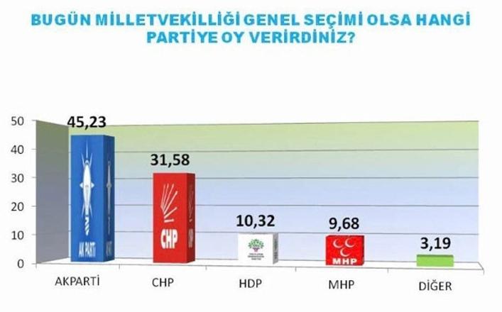 Yapılan araştırmaya göre, "Bugün, milletvekili genel seçimi olsa hangi partiye oy verirsiniz?" sorusuna vatandaşların, yüzde 45 AKP, yüzde 31 CHP, yüzde 10.3 HDP, yüzde 9.6 MHP diyerek yanıt verdi.