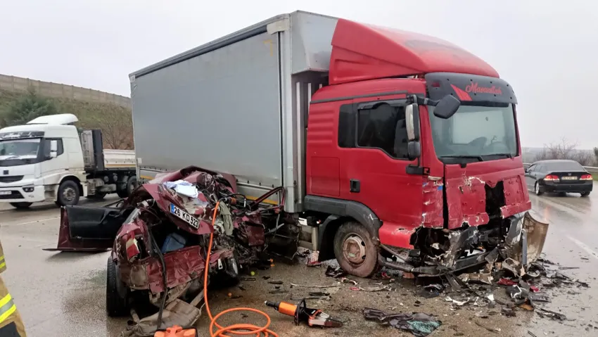 Bursa'daki akrabalarının düğün törenine ailesiyle birlikte katılmak için Çanakkale'nin Biga ilçesinden yola çıkan Şuayip Giren (25) yönetimindeki otomobil, yağmur nedeniyle kayganlaşan yolda kontrolden çıktı. Sürücü Giren'in direksiyon hakimiyetini kaybettiği otomobil savrularak bariyerleri aştı, karşı şeritten gelen İsmail A'nın kullandığı kamyonla çarpıştı.
