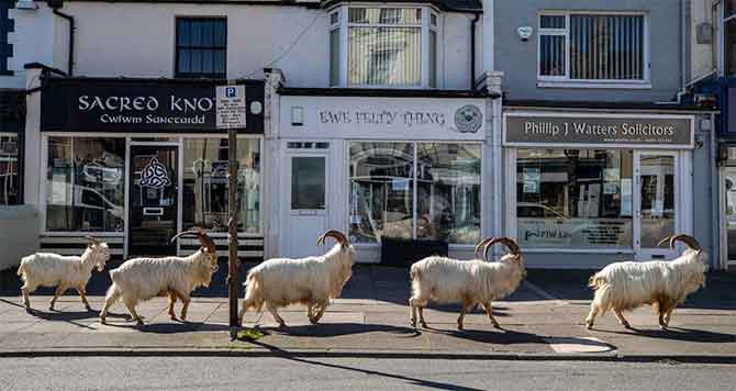 Bir keçi sürüsü Galler'in kuzeyindeki Llandudno kentinde keşfe çıkmış. Kentin belediye meclis üyesi Carol Marubbi hayvanların bomboş sokakları görünce tepelerden şehre indiğini söylüyor: "Meraklı hayvanlar. Herkes gibi onlar da ne olup bittiğini merak ediyor diye düşünüyorum."