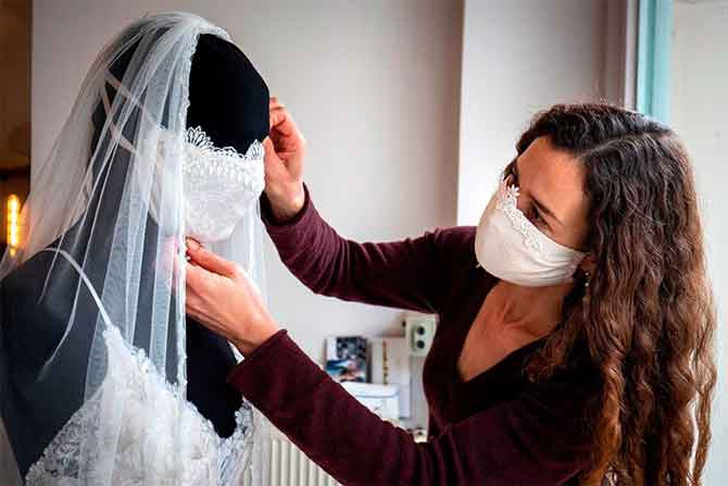 Gelinlik ve gecelik tasarımcısı Friederike Jorzig, Berlin'deki atölyesinde maskeli bir gelinlik tasarlıyor. Almanya'da düğünlerin de içinde olduğu kitlesel etkinlikler iptal edildi.