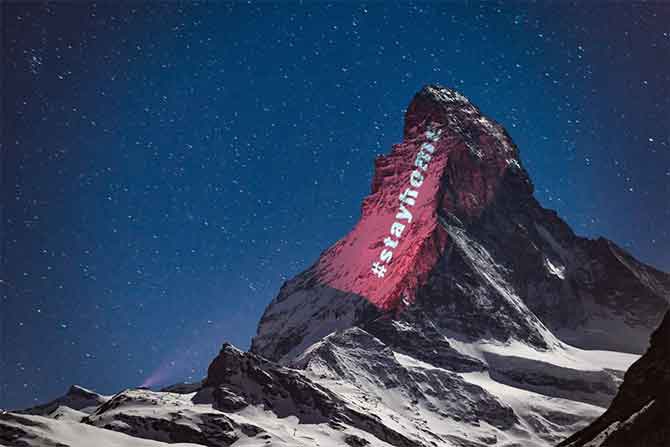 İtalya-İsviçre sınırındaki Matterhorn Dağı'na #stayhome (#evdekal) yazısı yansıtıldı. İsviçreli ışık sanatçısı Gerry Hofstetter bunun "umut ve dayanışma sembolü" olduğunu söyledi.