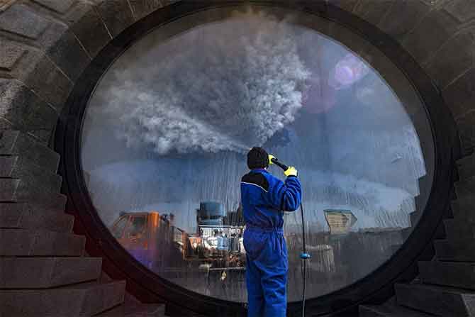 Çek Cumhuriyeti'nde bir işçi Vltava Nehri kenarındaki pencereleri dezenfekte ediyor.