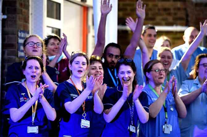 İngiltere'deki Dorset County Hastanesi'ndeki sağlık çalışanları, kendilerini alkışlayanlara aynı şekilde karşılık veriyor. İngiltere'de akşam saatlerinde nakliye görevlileri, süpermarket çalışanları, bakıcılar ve çöpçüler de alkışlanıyor.