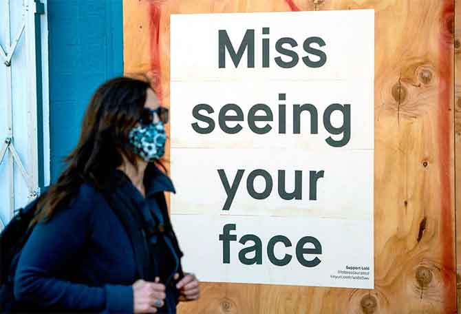 ABD'nin San Francisco kentinde bir kadın, koronavirüs nedeniyle kapanan bir restoranın üzerindeki "Yüzünüzü görmeyi özledik" ilanının yanından yürürken.