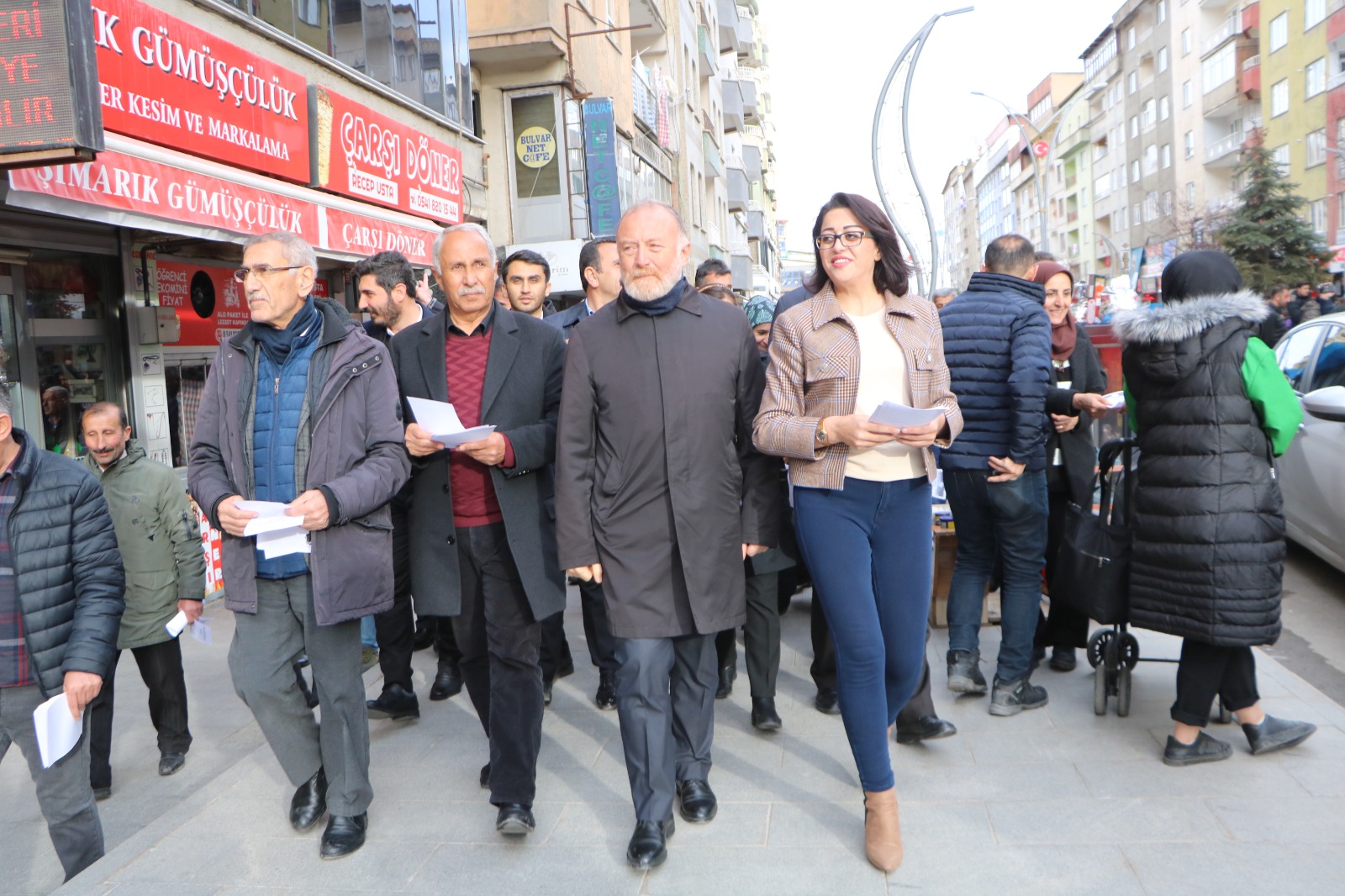 Miting hazırlıkları kapsamında kente gelen DEM Parti Muş Milletvekili Sezai Temelli, Hakkari Eski Belediye Başkanı Fadıl Bedirhanoğlu, Hakkari Milletvekilleri Onur Düşünmez, Öznur Bartın ve Vezir Parlak Belediye eşbaşkan Adayları Mehmet Sıddık Akış ve Viyan Tekçe, parti görevlileri ile birlikte esnafı ve vatandaşları mitinge davet etti.