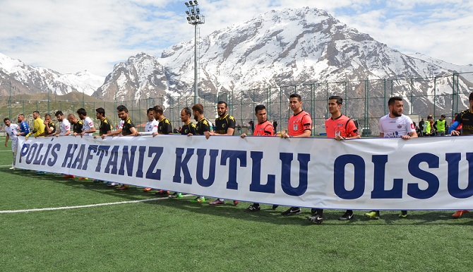 Her iki takımın oyuncaları, sahaya 20 metre uzunluğundaki “Polis Haftası Kutlu Olsun” pankartları ile çıktılar.
