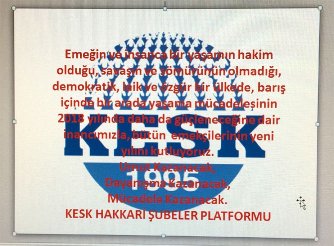 KESK HAKKARİ ŞUBELER PLATFORMU: Emeğin ve insanca bir yaşamın hakim olduğu, savaşın ve sömürünün olmadığı, demokratik, laik ve özgür bir ülkede, barış içinde bir arada yaşama mücadelesinin 2018 yılında daha da güçleneceğine dair inancımızla, bütün emekçilerinin yeni yılını kutluyoruz. Umut Kazanacak, Dayanışma Kazanacak, Mücadele Kazanacak.