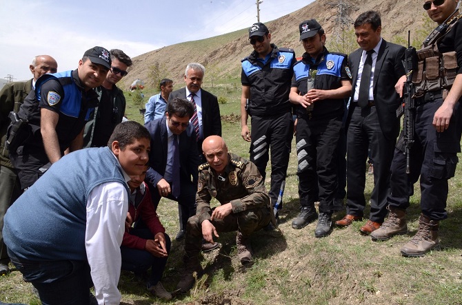 İl Emniyet Müdürü Dilberoğlu ve beraberindeki yetkililerin yanı sıra polis; öğrenci ve belediye çalışanları kent ormanında fidan dikti.