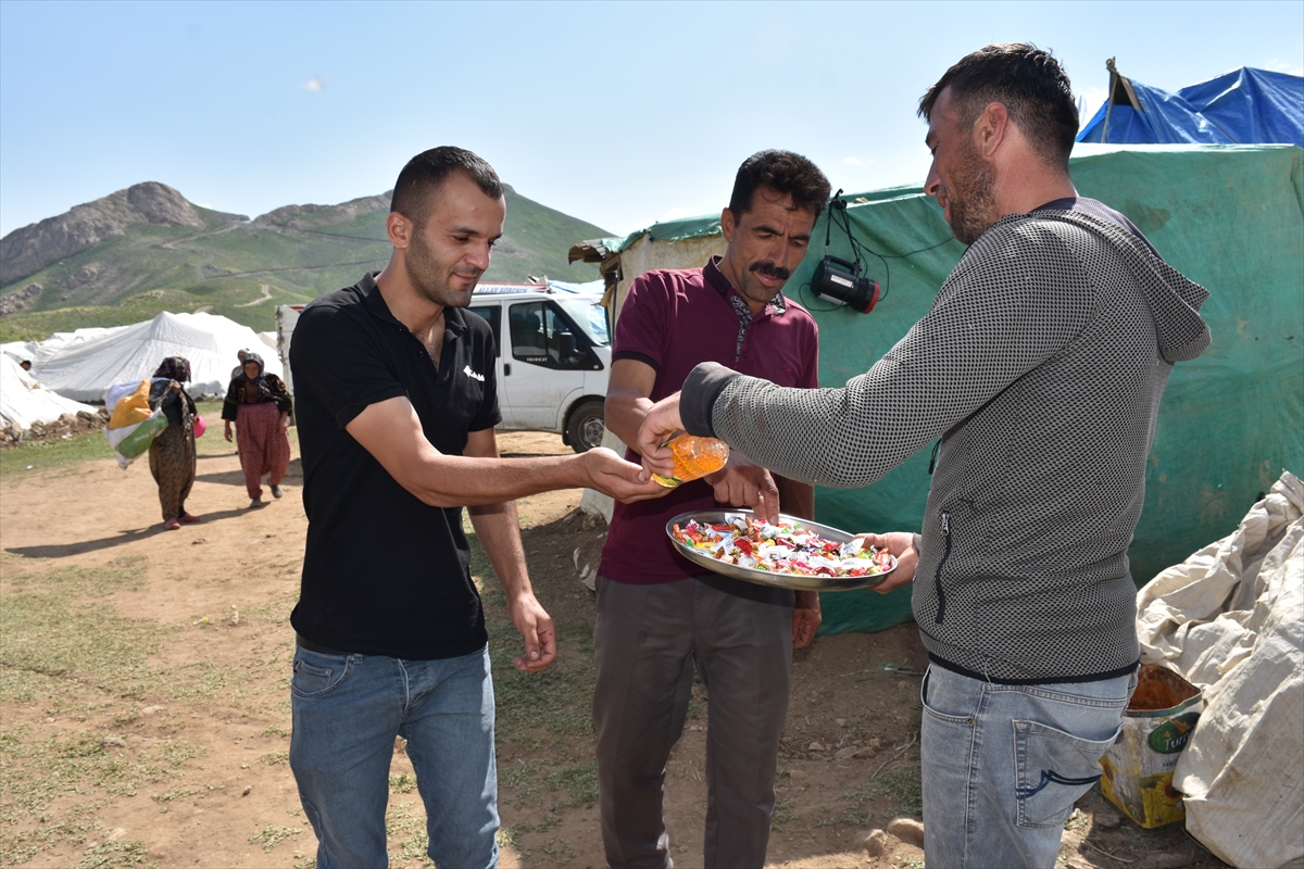 Hakkari'nin Durankaya beldesinde hayvanlarını otlatmak için 2 bin 800 rakımlı yaylaya çıkan yaklaşık 20 aile, kurdukları kıl çadırlarda bayramlaştı.