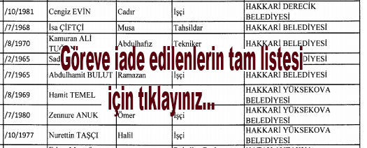 Hakkari ve ilçelerinde göreve iade edilenlerin isimleri şöyle: