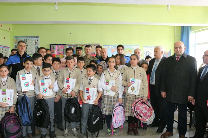 Hakkari Emniyet Müdürlüğü Çocuk Şubesince yürütülen "Mutlu Bir Gelecek İçin El Ele" Projesi kapsamında, öğrencilere çanta, Temel Eğitimden Ortaöğretime Geçiş (TEOG) sınavına hazırlık kitapları ve kırtasiye malzemesi yardımında bulunuldu.