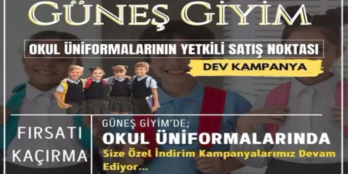 Bulak Mahallesi Cumhuriyet Caddesi üzerinde bulunan Güneş Giyim Mağazası her sene olduğu gibi bu yıl da okul sezonunda bütün okulların kıyafetler ile öğrenci ve velilerin hizmetinde.