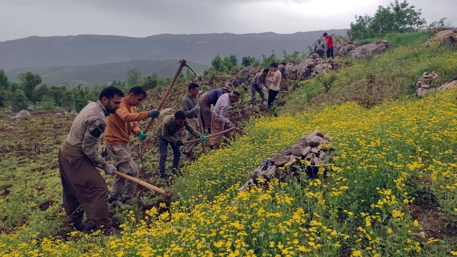 Hakkâri'nin Derecik ilçesindeki köylerde yaşayanlar, tarla, bahçe hazırlama ve üzüm bağları budama döneminde bölge engebeli olduğundan imece usulü işlerini yapıyor.