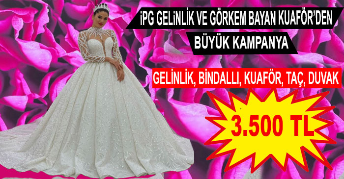 Kampanyamızda Gelinlik, Bindallı, Kuaför, Çiçek, Duvak, Taç Sadece 3.500 TL olacak.
