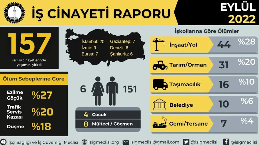 İş Sağlığı ve İşçi Meclisi Güvenliği (İSİG), 2022 yılının ilk 9 ayına yönelik hazırladığı iş cinayeti raporunu yayımladı. Rapora göre, eylül ayında en az 157 işçi, ilk 9 ayda ise en az 1359 işçi, iş cinayetinde öldü.