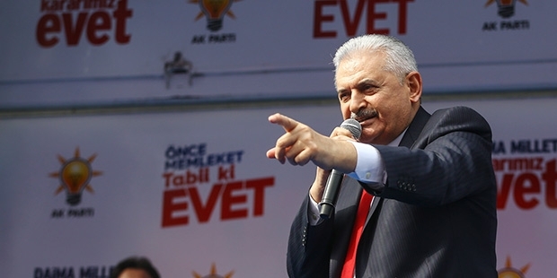 Anayasaya kimlerin karşı çıktığı sorusunu da vatandaşlara saran Başbakan Binali Yıldırım, "15 Temmuz'da asker kılığına girmiş FETÖ teröristleri, bu ülkenin tankını, topunu, tüfeğini uçağını çalarak milletin üzerine ateş ettiler. İnsanları, gözlerini kırpmadan öldürdüler. Bu alçaklara hak ettikleri cevabı pazara günü verecek misiniz? Anayasaya, PKK terör örgütü karşı çıkıyor. Kandil'den avaz avaz bağırıyor 'Aman çok çalışın, evet çıkarsa biteriz' diyorlar. Evet çıkacak, Kandil sönecek. Bu ülkenin artık terör belasından kurtulması lazım. Ülkemizi meşgul eden bu terörden kurtaracağız. Başka kim 'hayır' diyor? FETÖ var gücüyle, PKK ile kol kola girmişler, 'hayır' diyorlar. Bunlar aynı bedenin iki kolu gibi. Bunların yönetimi aynı yerde. Ülkesinin geleceğini, kalkınmasını istemiyorlar. Bu kadar açık söylüyorum. Kardeşliğimize halel getirmek isteyen, yıkmak isteyen şer yuvaları. Başka kim hayır diyor? HDP. HDP zaten PKK'nın güdümüne girmiş. 7 Haziran öncesi İzmir'de 'Türkiye partisi olduk. Türkiye'ye hizmet edeceğiz' diye buradan söz verdiler, o kadar insan bunlara destek verdi, oy verdi. Ne oldu? 8 Haziran'da bizim arkamızda PKK var, Kandil var diye gerçek niyetlerini ortaya koydular. İzmir, devlet, millet, bayrak, vatan için hep duyarlı oldu" dedi.