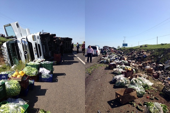 Şanlıurfa'nın Siverek ilçesinde sebze ve meyve yüklü tırın devrilmesi sonucu tır içindeki malzemeler yola savruldu.