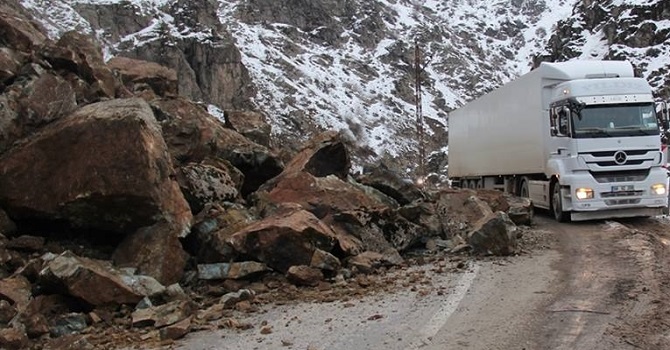 İlçede etkili olan yağışlar hayatı olumsuz etkilerken, Şemdinli- Yüksekova Karayolunda dağdan koparak gelen kaya parçası, trafiğin kapanmasına neden oldu.