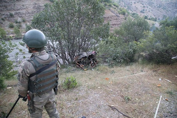 Kuzey Irak’ın sıfır noktasında düşen helikopterin enkazı çevresinde yoğun güvenlik önlemleri arasında olay yeri inceleme çalışmaları devam ediyor.