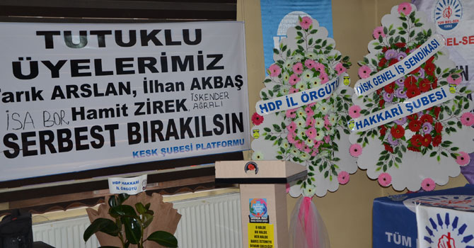 KESK Hakkari Şubeleri Sendikası toplantı salonunda yapılan kongreye, HDP ve DBP Hakkari il örgütü yöneticileri, İHD Hakkari Şube başkanı İsmail Akbulut ve yöneticileri, Hakkari Esnaf ve Sanatkarlar Odası Başkanı İsmail Akboğa, KESK bileşenleri atıldı.