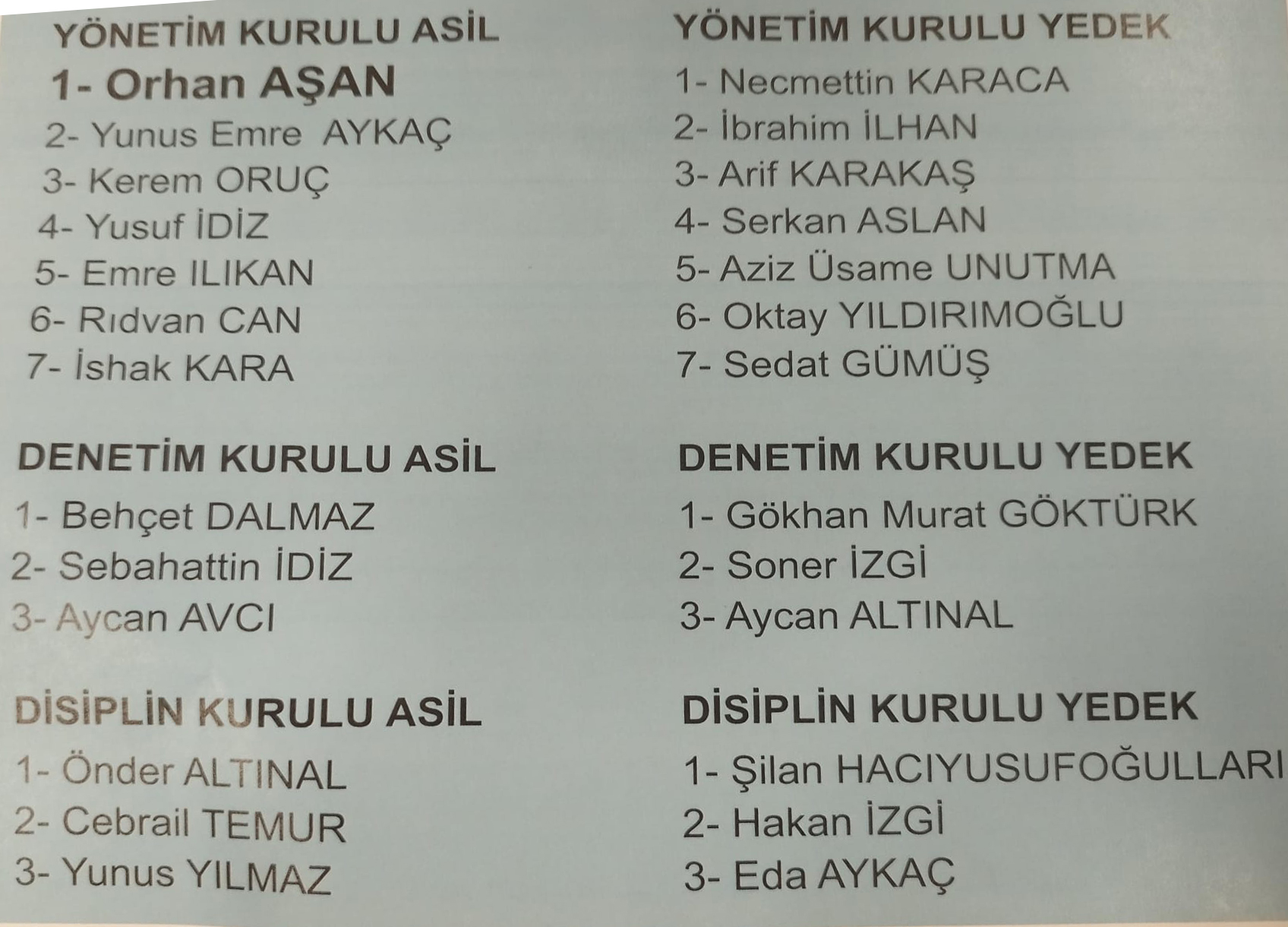İŞTE ORHAN AŞAN’IN YÖNETİM KURULU LİSTESİ;