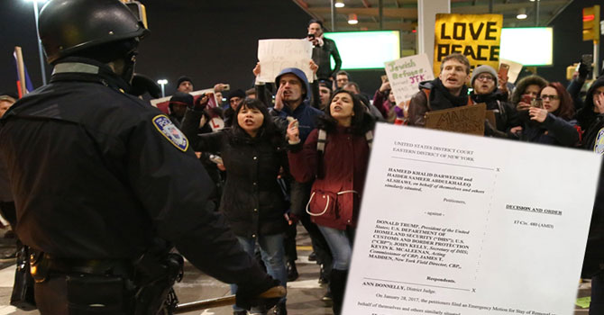 Amerikan Sivil Özgürlükler Birliğinden avukatlar gözaltına alınan Irak vatandaşlarının serbest bırakılması ve Trump'ın mültecilerin ve bazı Müslüman ülkelerin vatandaşlarının ülkeye girişini engelleyen kararın durdurulması için dava açmıştı.