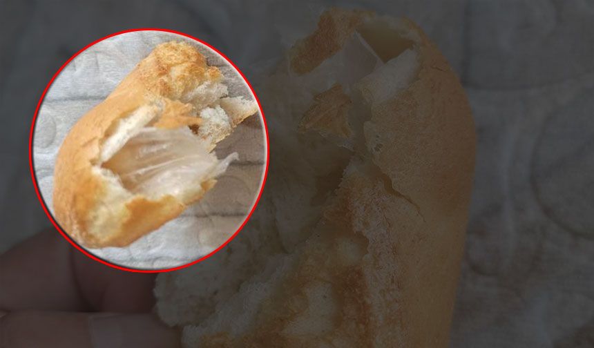 Ekmeğin içinden çıkan büyük bir poşet parçasını gören vatandaş, gördüğü manzarayı cep telefonu kamerasıyla kaydetti.