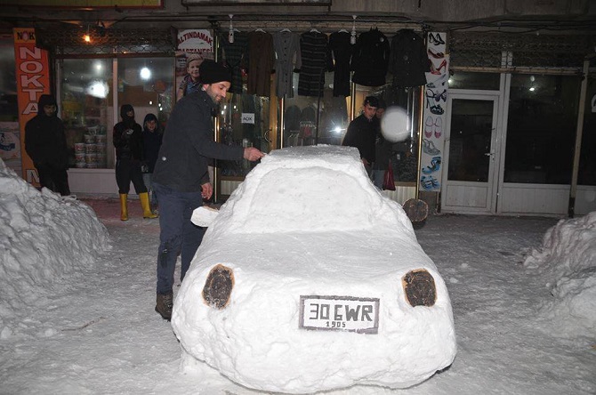 Nedim Zeydan Caddesi'nde esnaflık yapan Turgut Esener, esnaf arkadaşlarının da yardımıyla iş yerinin önünde kardan 2 metre uzunluğunda ve 1 metre genişliğinde araba yaptı.