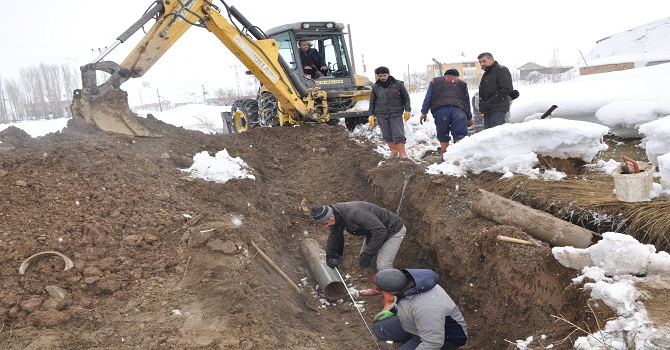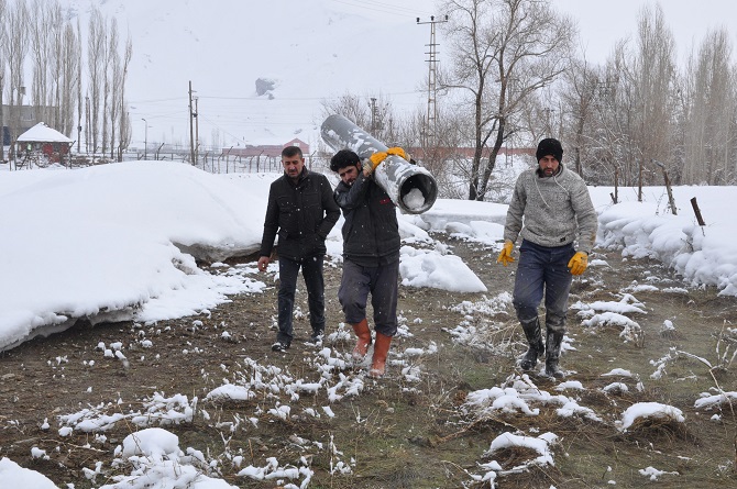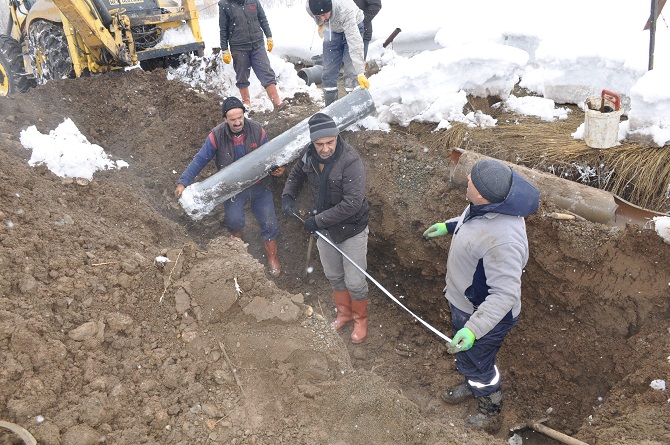 Suyun gitmediği bölgelere yeniden su vermeye başlayan ekipler İlçenin çetin geçen kış şartlarında arızanın oluştuğu yerde yol olmadığı için gerekli malzemeyi sırtlarında taşıdılar.
